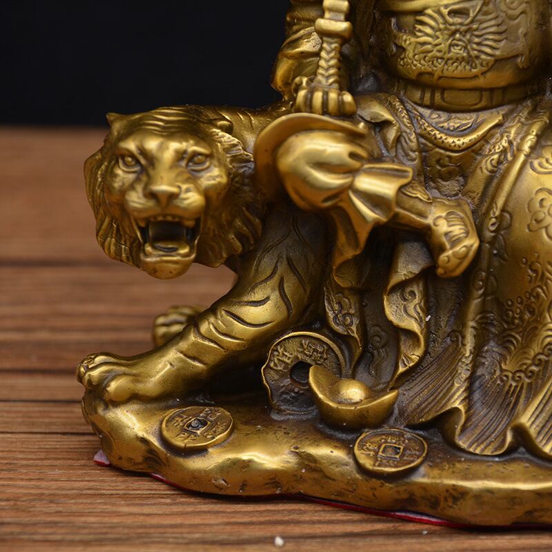 古来より財運を司るとされる財神・趙公明を模した美しい置物です。趙公明は、中国の風水や信仰において、富と繁栄をもたらす存在として尊敬されています。彼は虎に乗っている姿で描かれることが多く、その力強さと威厳が、持ち主に勇気を与え、金運や仕事の成功を引き寄せると信じられています。