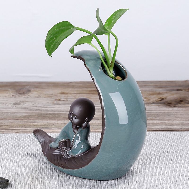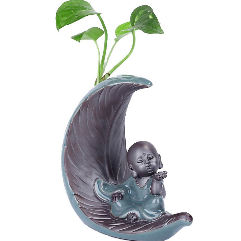 この花瓶は、ブルーの美しい色合いで、自然と調和しながら、心を落ち着ける効果が期待されています。さらに、水耕栽培にも対応しており、植物を育てることで、風水的にも良いエネルギーを引き寄せると言われています。植物の成長と共に、僧侶の祈りの姿が、家庭やオフィスに癒しの空間を提供し、運気や繁栄を願う方々に適したアイテムです。
