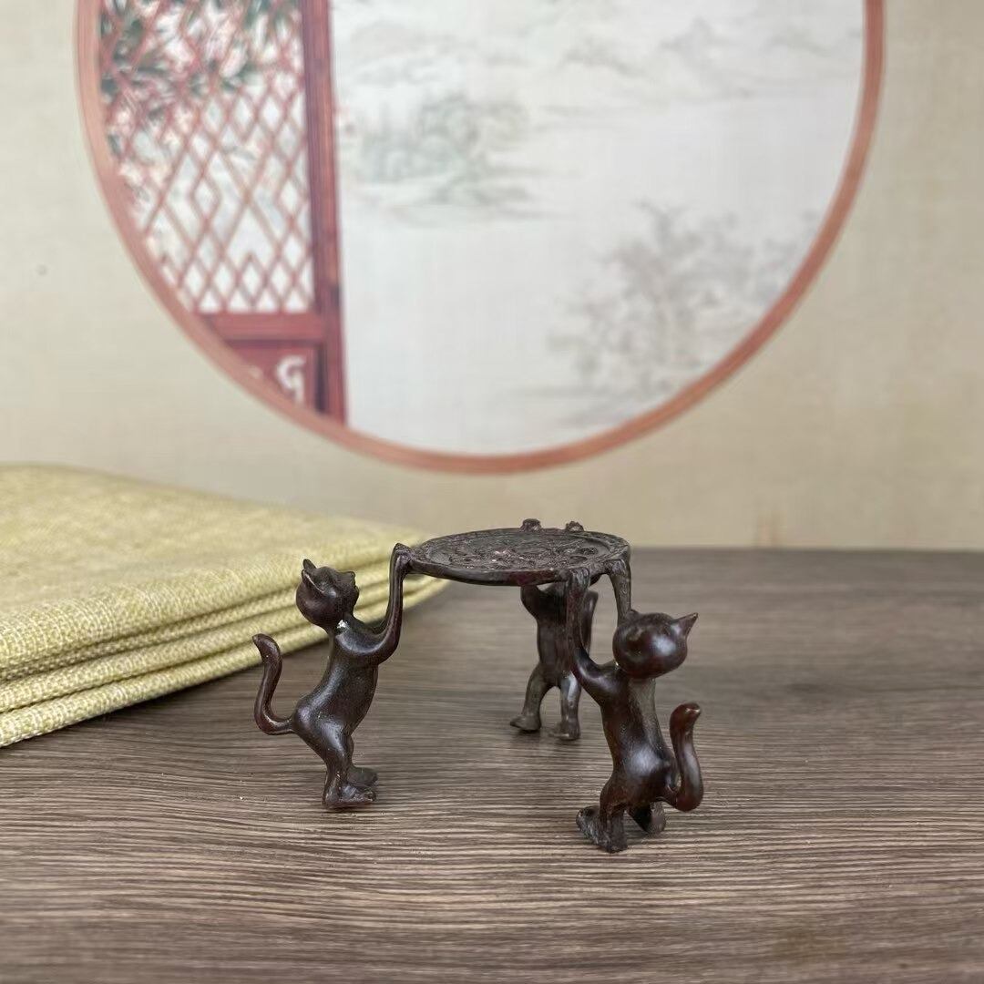 銅製の精緻な作りが、長い年月を経て輝きを増し、風水的にも安定と繁栄をもたらすと言われています。風水では、猫は家や店舗に良いエネルギーを引き寄せ、守護神としてその空間を守る力があるとされており、「三猫茶壺蓋置」はその象徴として、日々の運気を支える存在となることでしょう。