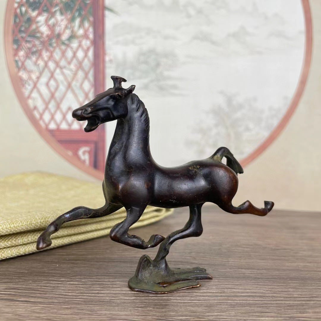 力強さと優雅さを兼ね備えた銅製の馬のオブジェです。馬は古くから、力強さ、成功、繁栄を象徴する存在として広く信仰されています。特に風水において、馬は進展と向上の象徴とされ、運気を引き寄せる力を持つと信じられています。
