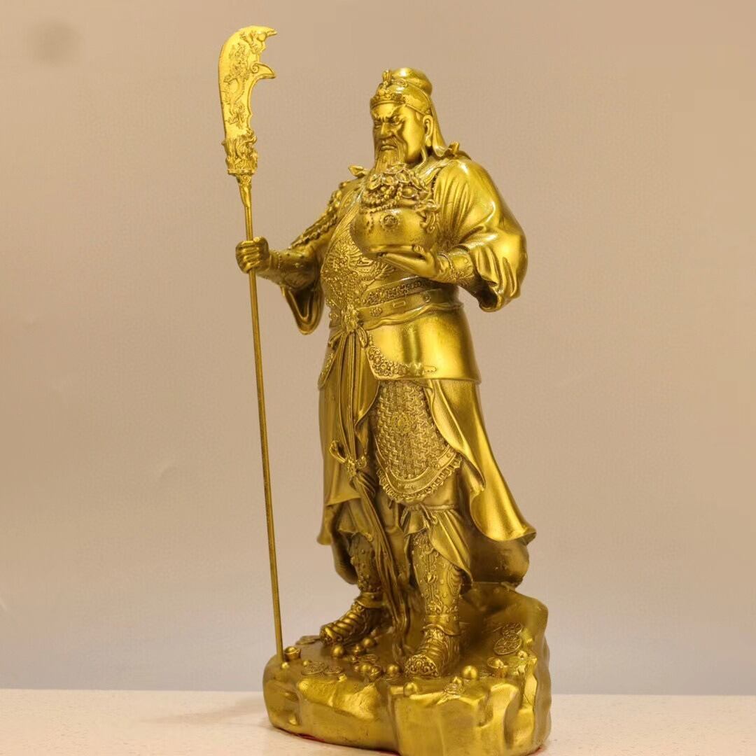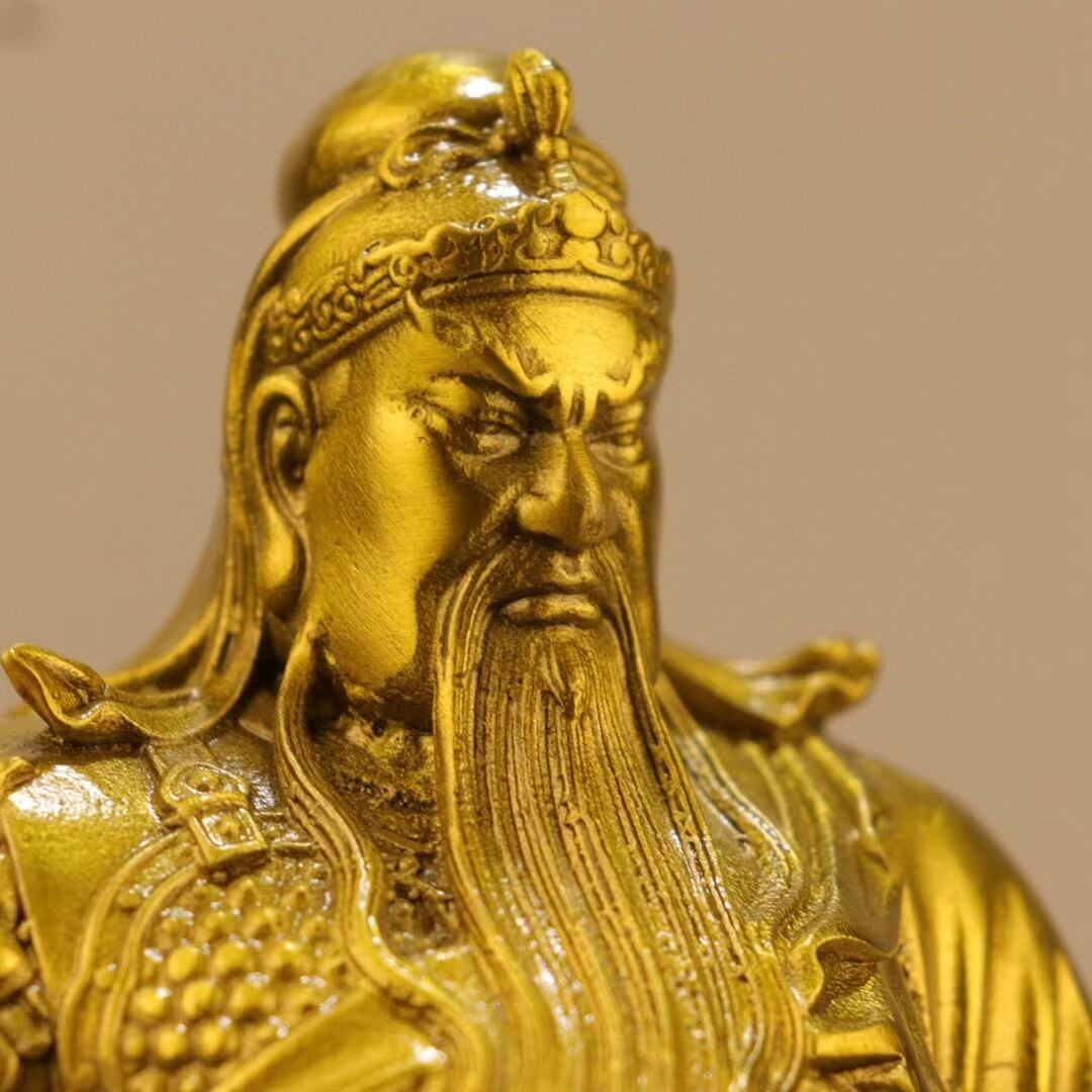 こちらの関公像は、重厚な銅で精巧に造られており、その堂々たる風格が空間に力強いエネルギーをもたらすと信じられています。関羽が剣を携え凛々しく立つ姿は、邪気を遠ざけ、空間の氣を整える助けとなるとも言い伝えられています。