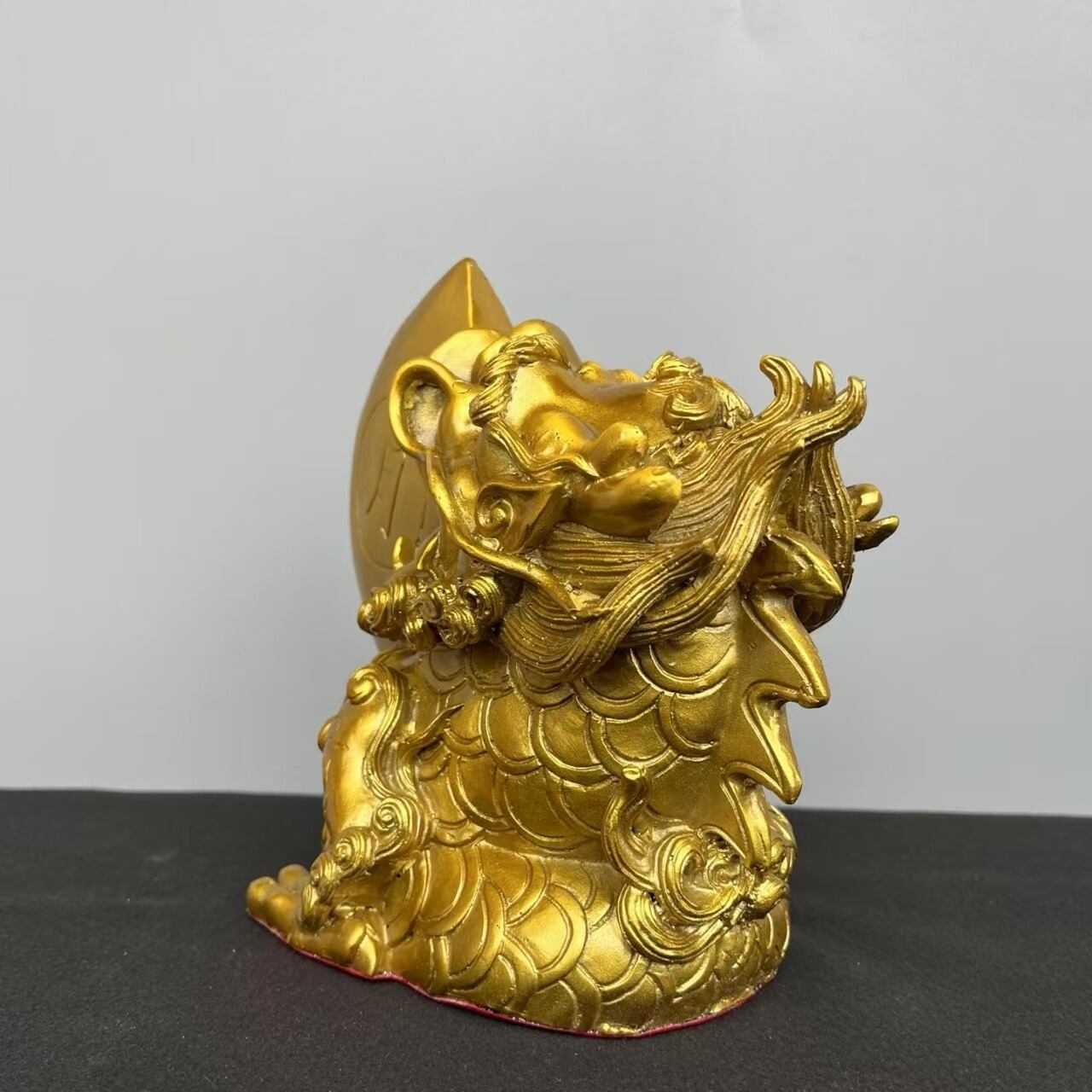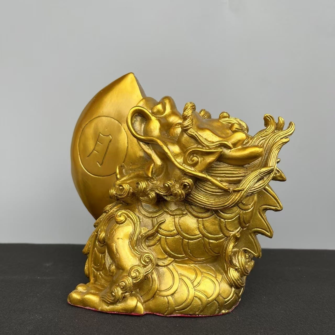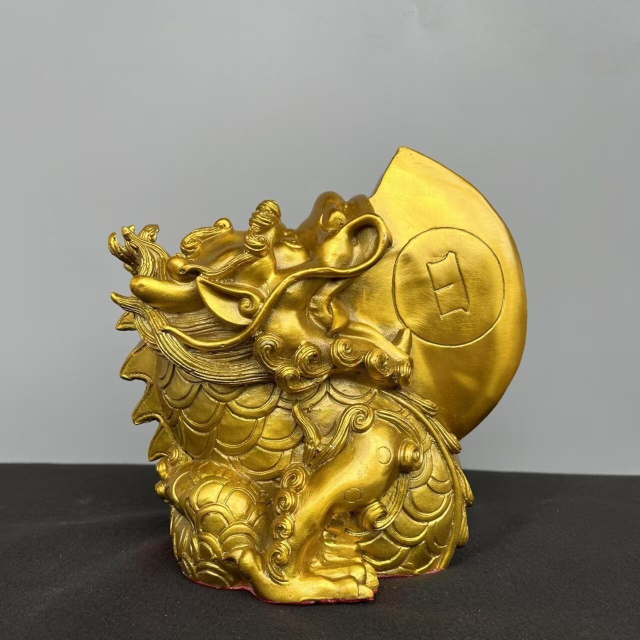 この作品は、美しいゴールドの色調と重厚な銅製の質感が融合した、存在感のある逸品です。風水では、睚眦は財産を守り、悪意や妨げから持ち主を遠ざけるとされており、商売繁盛や人間関係の改善を願う人々に好まれてきました。デスクや玄関、仕事場などに飾ることで、集中力と自信を引き出す助けになるとも言われています。