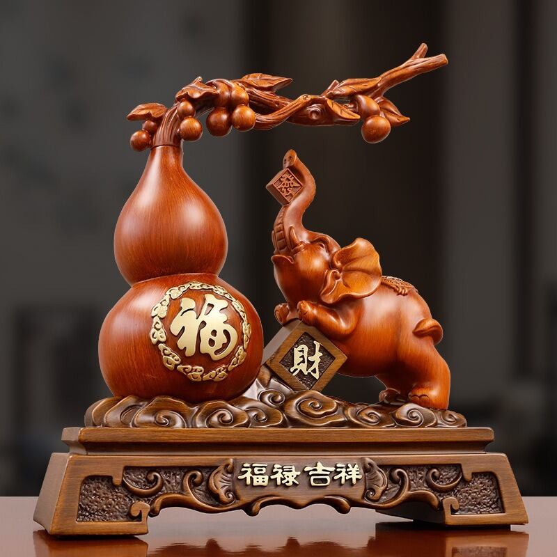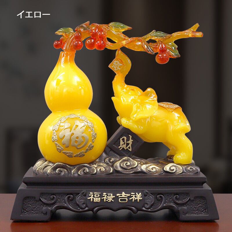 縁起の良い瓢箪と象を組み合わせた美しい置物です。瓢箪は、古来より富や長寿、繁栄を象徴するアイテムとして広く信仰されています。その形状が福を蓄える器に似ていることから、運気を引き寄せ、幸運を呼び込むとされています。さらに象は、アジアをはじめ世界中で知恵、力、そして幸運をもたらす神聖な存在として尊ばれています。