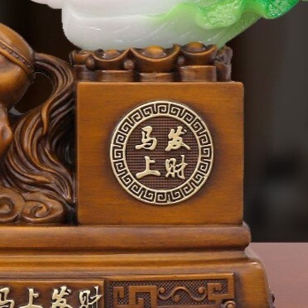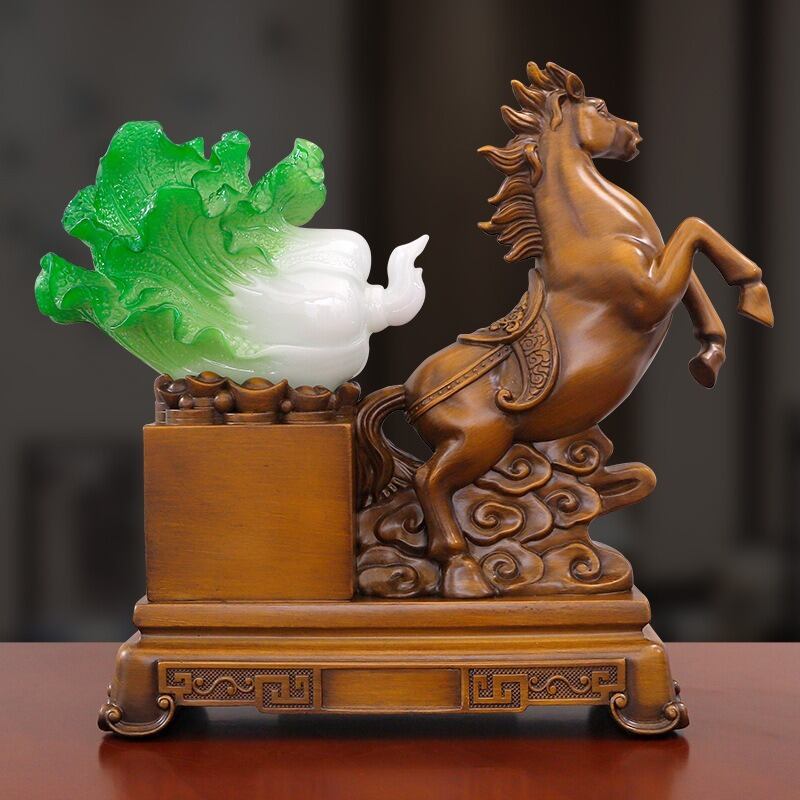また、白菜は中国の伝統的な縁起物であり、金銭的な繁栄をもたらすと信じられています。特に「白菜=財」という言葉遊びがあり、金運を高める象徴としてよく使われています。このオブジェでは、馬と白菜が一体となり、繁栄と幸福を追求する強いエネルギーを放つとされています。
