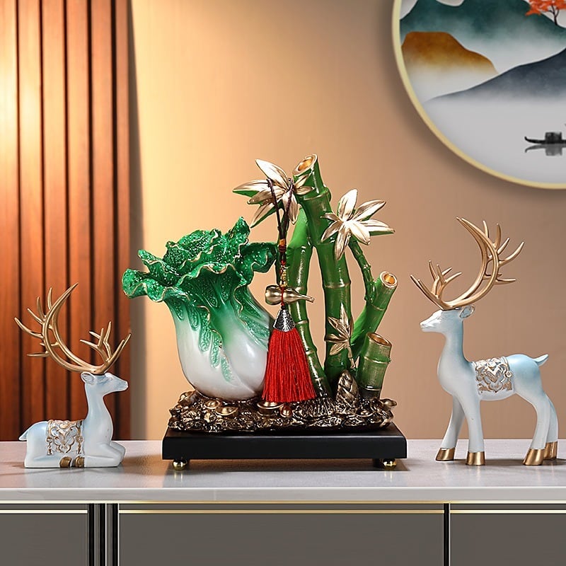 この樹脂製の置物は、色鮮やかな仕上がりで、細部にわたる精緻な彫刻が施されており、インテリアとしても一層魅力を増します。飾ることで、家やオフィスに温かみとポジティブなエネルギーをもたらし、日々の生活に活気と明るさを与えることでしょう。竹と白菜が調和を生み出し、空間を清々しく整える手助けをしてくれるかもしれません。