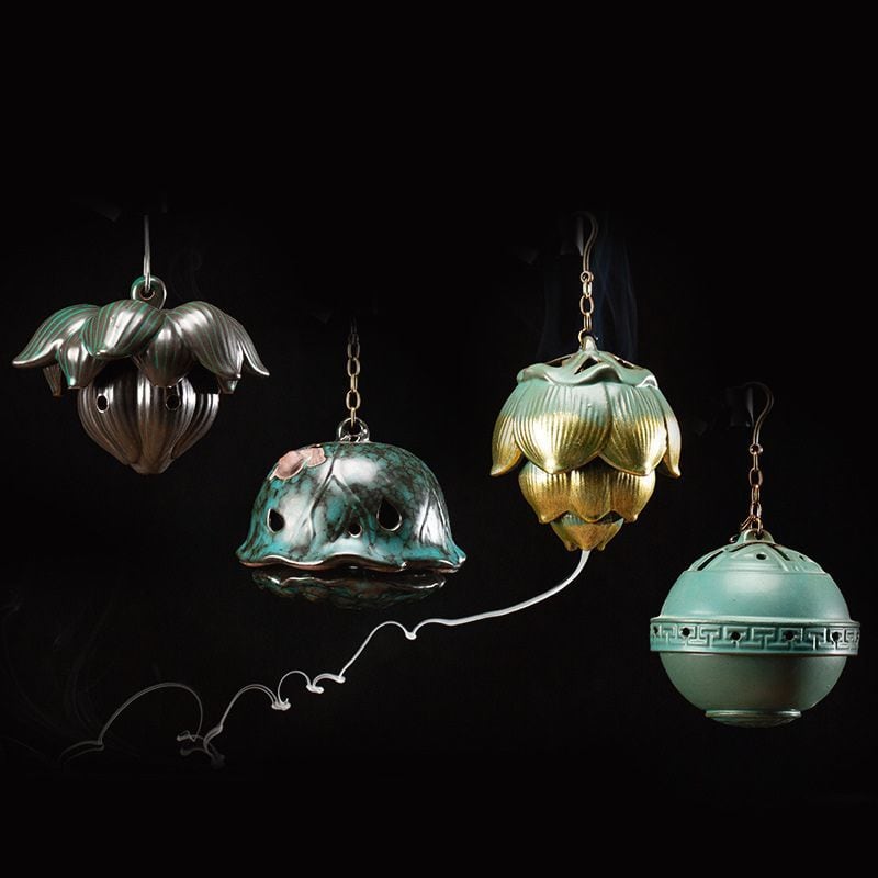 こちらの吊り下げ式香炉は、蓮花や香囊、香球を模したデザインで、いずれも細部まで丁寧に仕上げられています。蓮は清浄と再生を象徴し、禅の心を表す吉祥の花。香囊や香球は「邪気を払う守護の護符」とされ、身近に置くことで安心をもたらすと伝えられています。