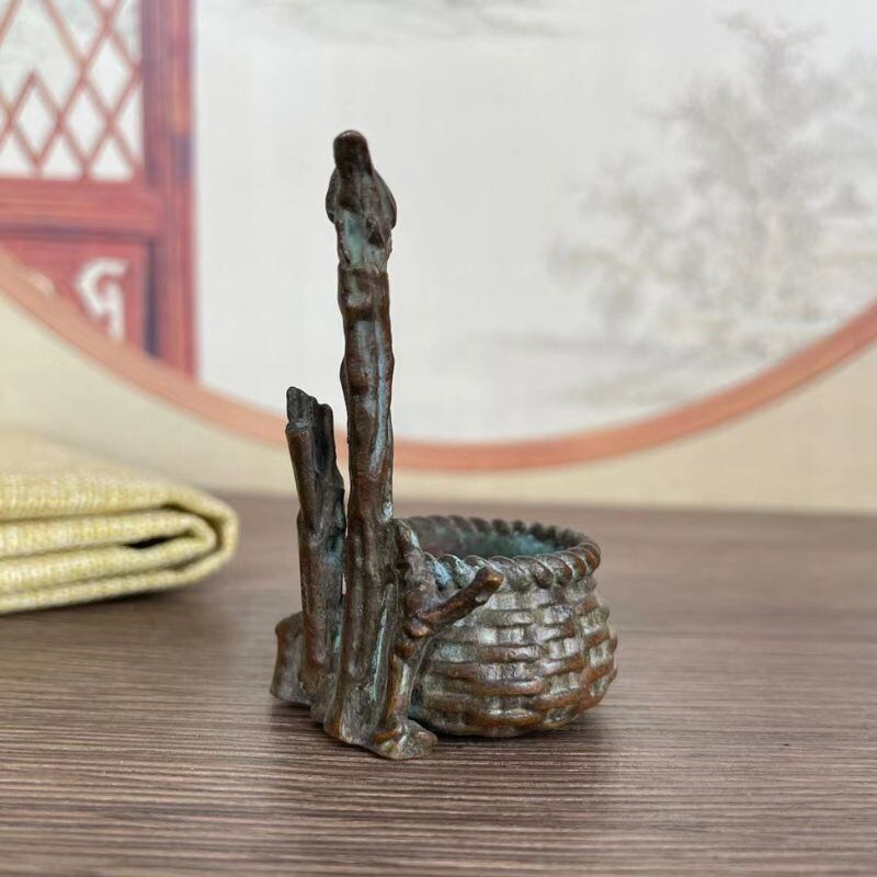 古き良き時代の趣を感じさせる、鳥と魚籠をモチーフにした銅合金製の香炉です。アンティーク調の風合いと手仕事を感じる細かな造形が魅力で、骨董コレクションとしても、茶席の飾りとしても存在感を放ちます。