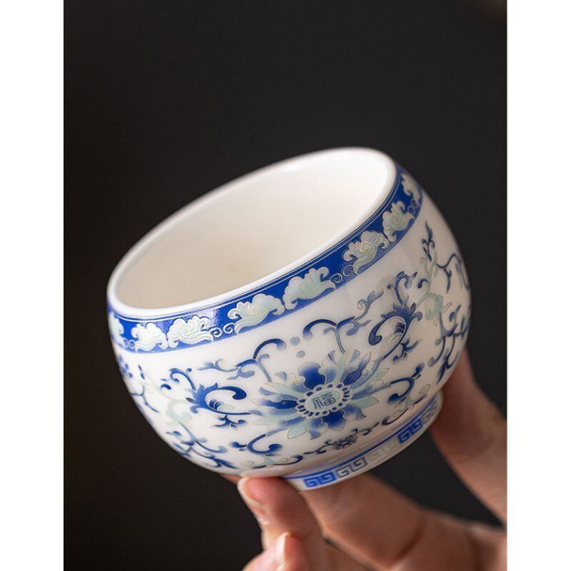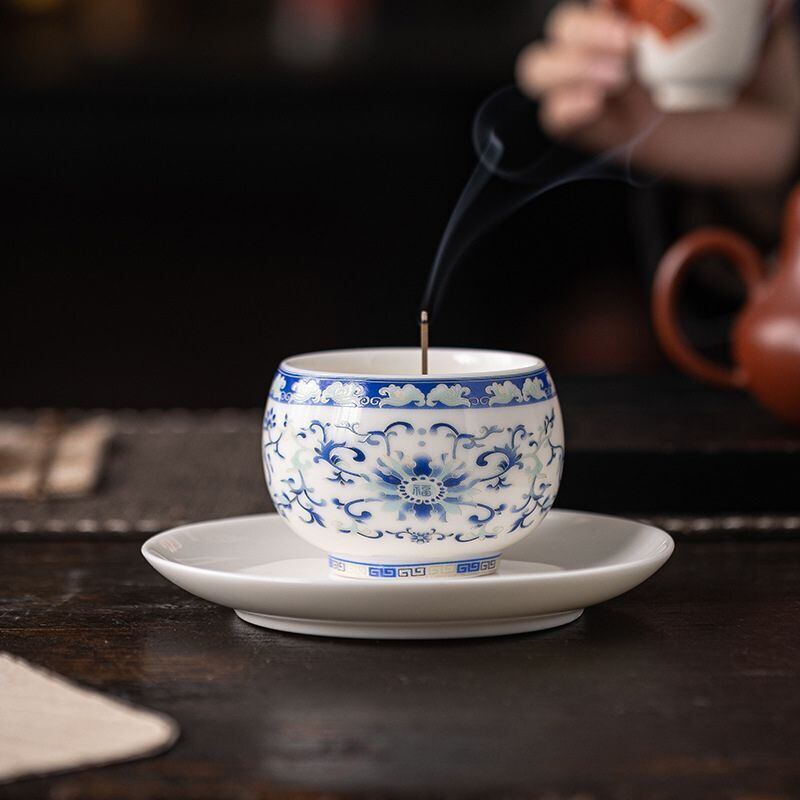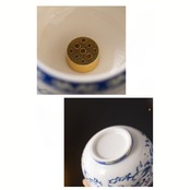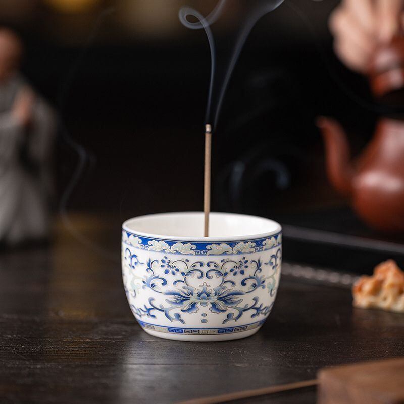 こちらは、青花模様の小型陶磁製香炉です。丸みを帯びた可愛らしいフォルムに、白地に映える青色の草花文様があしらわれており、どこか清らかで落ち着いた雰囲気を漂わせます。中国伝統の青花磁(せいかじ)の意匠は、古くから「清浄」や「吉祥」を象徴するものとされ、場を清める香炉にふさわしい装いとなっています。