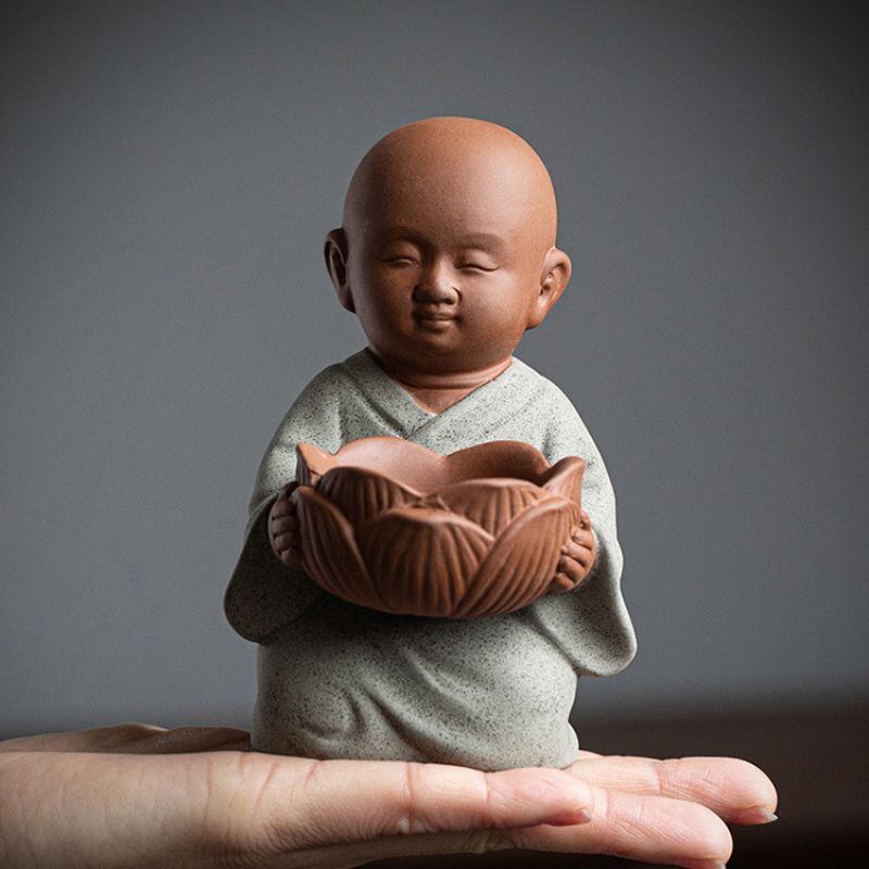 小僧さんが抱えているのは、清らかさの象徴とされる蓮の花を模した器(香炉)です。蓮は、泥の中から美しい花を咲かせることから、「苦難を乗り越え、悟りを開く」といった意味合いがあるとされ、開運や幸運を願うモチーフとして親しまれてきました。その蓮華の器にお香やコーン香を置き、静かに立ち上る香煙を眺める時間は、心を深く鎮めるきっかけになるかもしれません。
