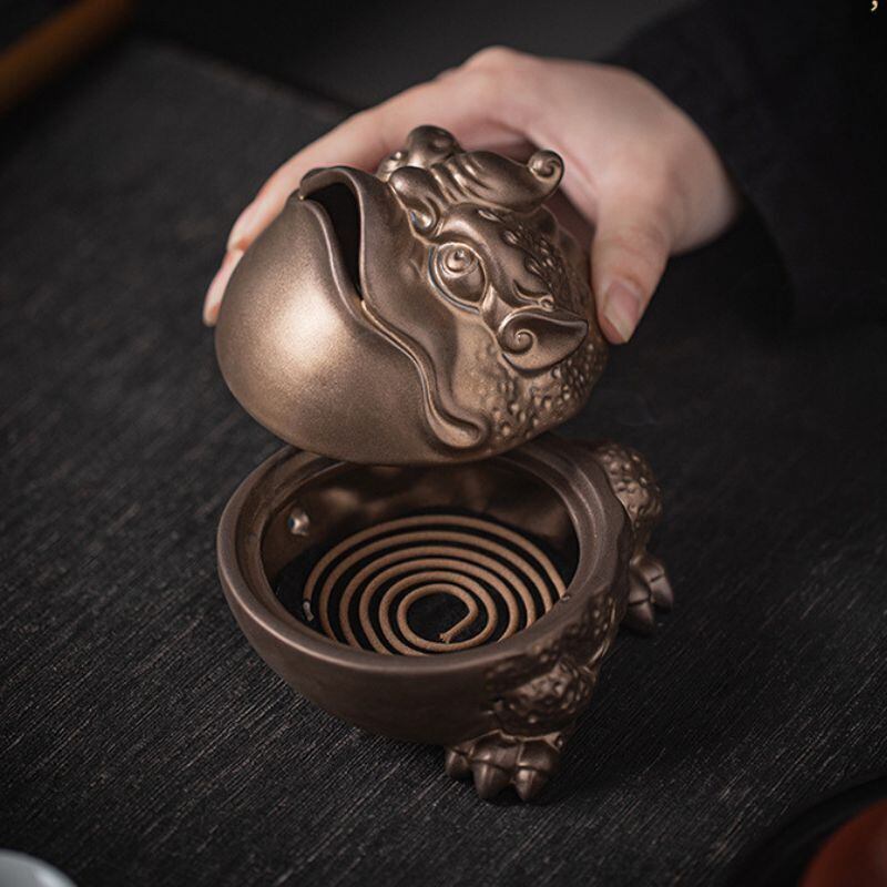 この香炉の使い方は非常にシンプル。上下に分かれる胴体の中に線香や渦巻き香をセットすれば、カエルの口から香煙がゆらゆらと立ち上ります。その姿は、金運を招き入れる神秘的な気を演出しているようでもあり、癒やしの時間を深くしてくれるでしょう。心地よい香りとともに、カエルの力強い姿を眺める時間は、日々のストレスを遠ざけ、前向きな気持ちを養うきっかけになるかもしれません。