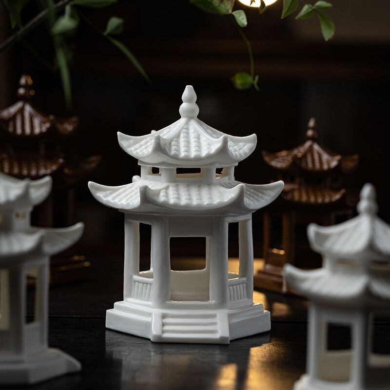 こちらの精巧なミニチュア東屋の置物は、アジアの伝統的な楼閣やあずまやを模した、和の趣と禅の静けさを感じさせる陶器製の飾り物です。純白の白磁(タイプ1~3)や重厚感のある茶金色(タイプ4~6)など、バリエーション豊かな質感と形状から、お好みの静寂な情景を選べるでしょう。細部まで丁寧に作り込まれた屋根や柱は、小さな世界に確かな存在感をもたらしています。