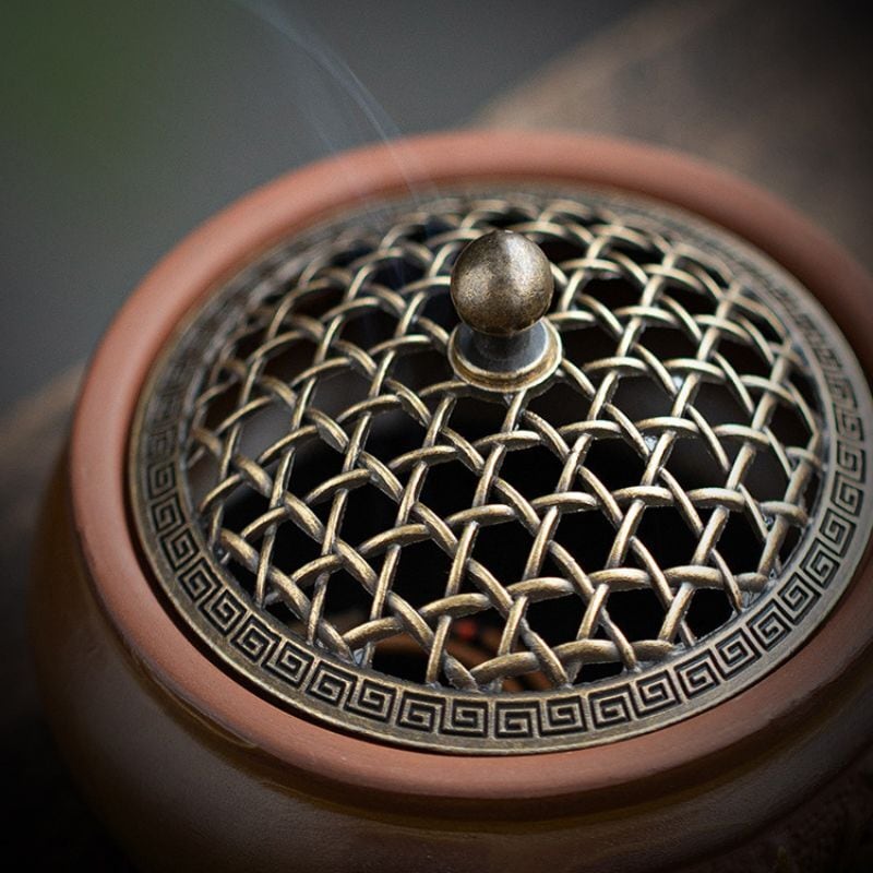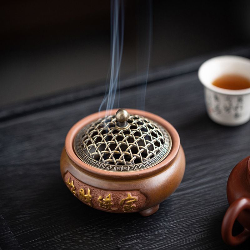 この香炉は、線香や渦巻き香、コーン香といった多様なお香に対応できる多機能な設計です。蓋を閉めてお香を焚けば、透かし穴から香煙が優雅に立ち上り、室内空間に穏やかな気を満たしてくれます。心地よい香りとともに、香炉の丸い宝珠のような形を眺める時間は、心の静寂を取り戻し、日々のストレスを遠ざけることに役立つでしょう。