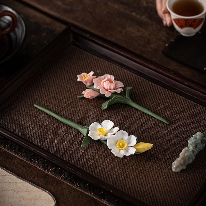 この花の飾りをお茶の道具としてだけでなく、玄関やデスクに飾るミニチュアオブジェとしても活用してみてください。生花を飾ることが難しい場所でも、陶器の美しい花が空間の気を明るく整えてくれることが期待されます。風水では、美しいものや縁起の良いモチーフを飾ることで、運気の流れを整え、人生の転機を穏やかに後押ししてくれると言われています。