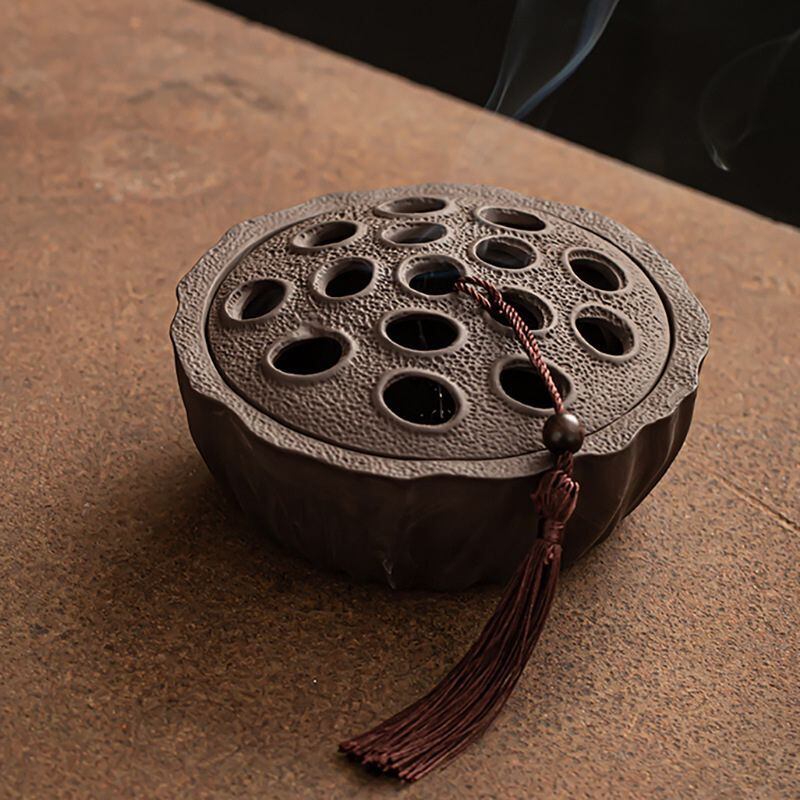 こちらの蓮の葉と実を模したデザインの蓋付き香炉は、泥の中から清らかに咲く蓮華の持つ精神的な美しさを表現した、趣深い陶器製の置物です。紫砂(赤茶色)と黒陶(黒色)の素朴で落ち着いた質感が、和や禅の空間に深く馴染み、静寂な雰囲気を演出してくれるでしょう。蓋に開いたハスの実のような穴は、香煙を美しく立ち上らせるだけでなく、通気性にも優れています。