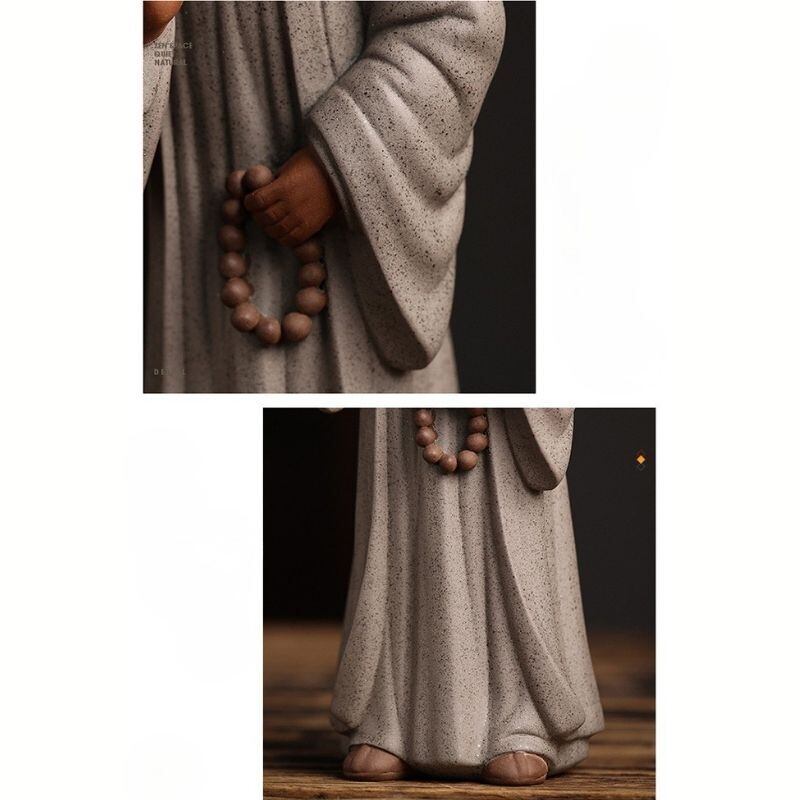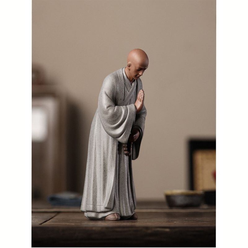 この置物を玄関、書斎、茶席、リビングなどの目の届く場所に飾ってみてください。風水では、敬虔な人物のモチーフは、家の運気や住む人の精神性を穏やかに高め、運気の流れを安定させることが期待できると言われています。その静かな佇まいが、あなたの心を浄化し、日常の喧騒を忘れさせるでしょう。お茶請けの場に飾る茶寵としても、静謐な雰囲気を深めてくれます。