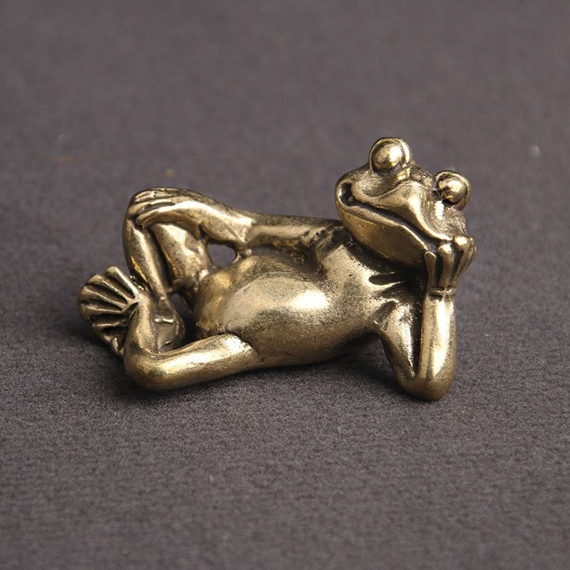 こちらの頬杖をつき、ゆったりとくつろぐ姿がユーモラスなカエル(蛙)のミニチュア置物は、リラックスした日常と確かな幸福を招く縁起の良い飾り物です。真鍮のような重厚で味わい深い質感と、愛嬌のある表情が、見る人の心を和ませ、日々の疲れをそっと癒やしてくれるでしょう。その姿は、**「人生はもっと気楽でいい」**と語りかけているかのようです。