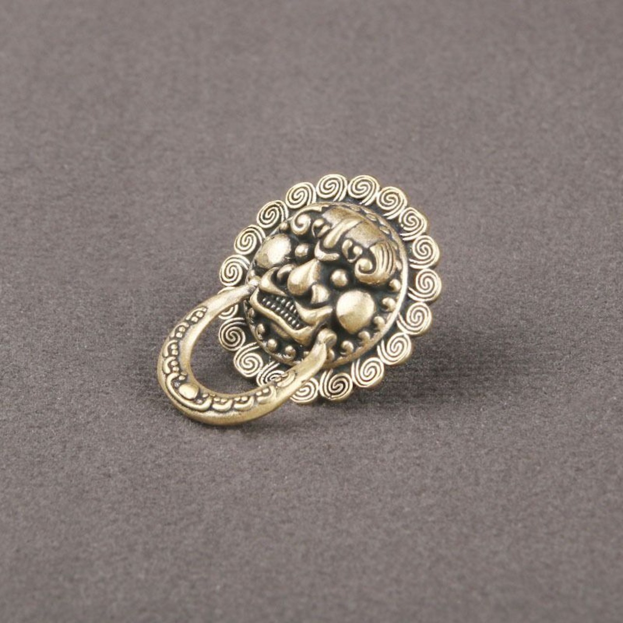 このデザインは、古来より中国の宮殿や豪邸の門扉を飾ってきた「鋪首(ほしゅ)/ 獣頭環(じゅうとうかん)」と呼ばれる、魔除けと権威の象徴をモチーフとしています。力強く威厳のある顔つきと、周囲に渦巻く祥雲(しょううん)のような吉祥文様は、家や持ち主をあらゆる邪悪なものから守り、良い運気だけを招き入れるという強いメッセージが込められているように感じられます。