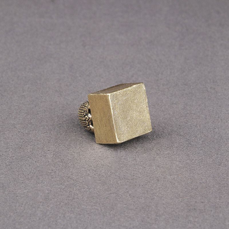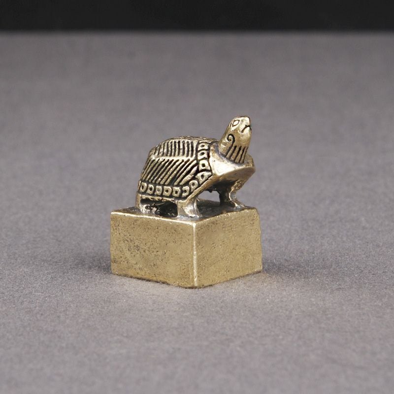 黄銅の温かみある輝きが美しい、亀モチーフの印鑑風置物です。手のひらにおさまる小ぶりなサイズながら、しっかりとした重みと存在感があり、静かに空間を引き締めてくれるアイテムです。