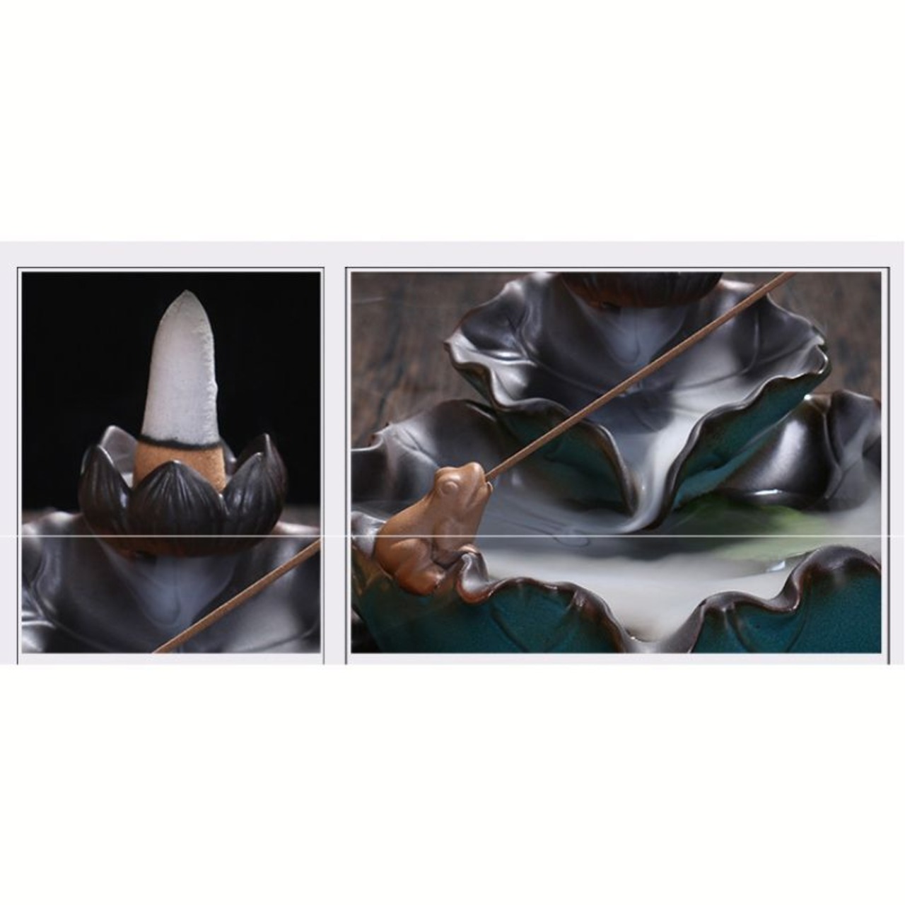 静寂の中に漂う香りとともに、穏やかに流れ落ちる白煙。まるで蓮の花が大地の穢れを包み込み、心を清らかに洗い流すような光景が広がります。こちらの「蓮と蛙の逆流香炉」は、風水の中でも特に浄化と金運上昇に強く働きかけるとされる、蓮と蛙を組み合わせた縁起の良い香炉です。