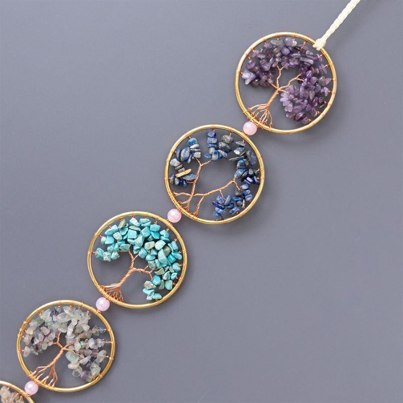 七つの天然石が連なるこのサンキャッチャーは、古来より“生命の樹”として知られるツリーオブライフのモチーフを用いた、美しく神秘的なインテリアオブジェです。七つの輪がそれぞれ異なる色の天然石で彩られ、チャクラ(エネルギーの流れ)を整える象徴として、空間に穏やかな調和をもたらすように感じられます。