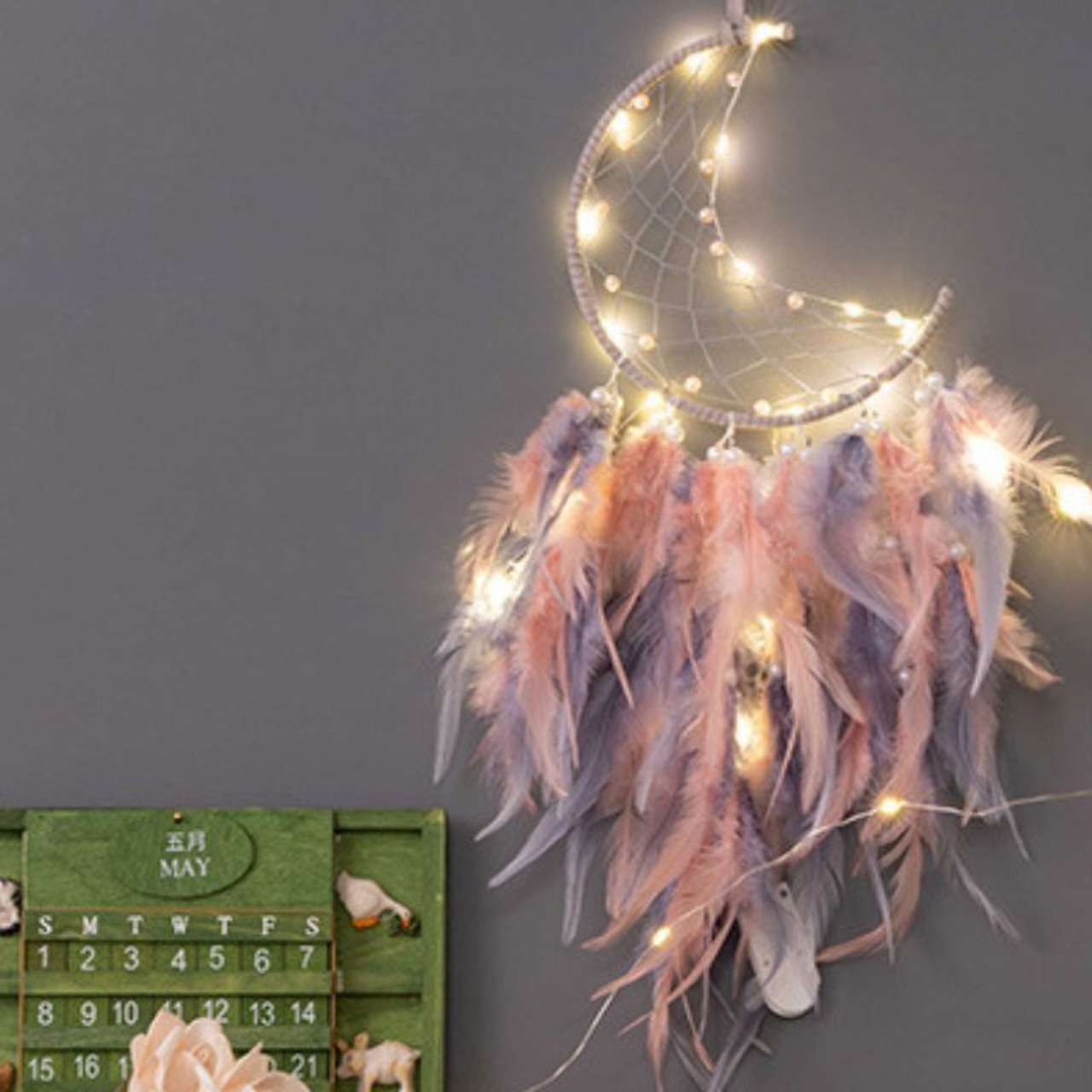 このドリームキャッチャーは、幻想的な美しさと癒しのエネルギーを空間に届けてくれるアイテムです。美しい月型の枠に繊細なフェザーが施され、優しい色合いが心を落ち着けます。その中に輝くLEDライトが加わることで、夜の空間を温かく包み込み、まるで夜空に浮かぶ月のような幻想的な雰囲気を作り出します。