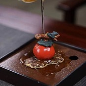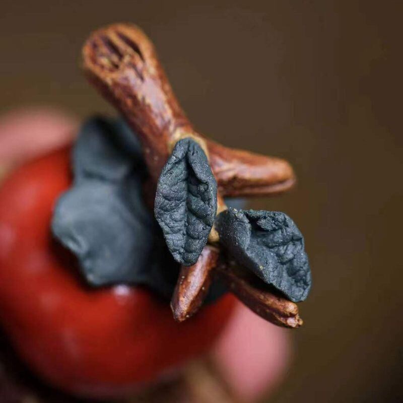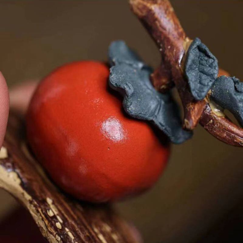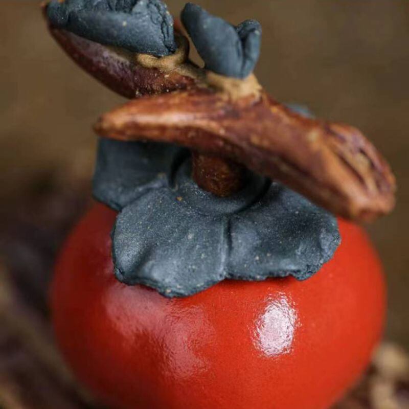 艶やかな朱色が印象的な、宜興紫砂(ぎこうしさ)製の「柿如意(かきにょい)」置物。