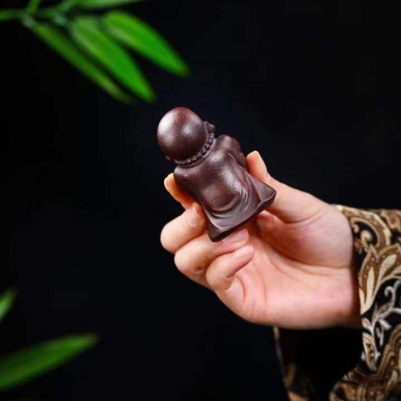 風水の観点では、小僧や僧侶をモチーフにした置物は「心の安定」や「空間の浄化」を象徴すると伝えられることがあります。祈る姿は調和と平穏を招く象徴とされ、リビングや書斎、寝室など、落ち着きを求める場所に置くことで、穏やかな気の流れを生み出すと語られることもあります。また、紫砂の自然素材が持つ土の気は、空間に安定感や安心感をもたらし、気を落ち着けたい時のサポートになってくれるように感じられます。