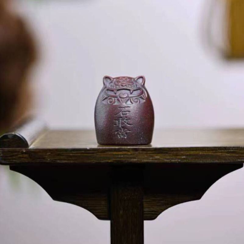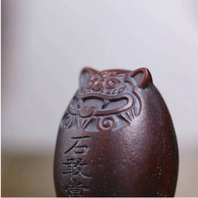 こちらは、中国・宜興の紫砂で作られた、石敢当(せきがんとう)と虎をモチーフにした茶寵置物です。丸みのある手のひらサイズで、重すぎない見た目の中に、どっしりとした安心感のある佇まいが感じられます。茶台の上はもちろん、棚やデスク、玄関先などにも置きやすく、日常の空間に自然に溶け込みます。