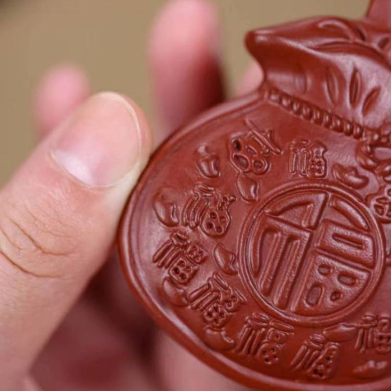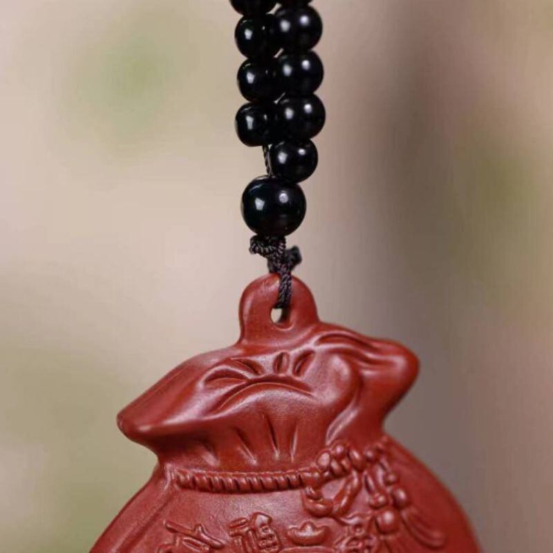 ころんとした愛らしい形が印象的な、宜興紫砂の福袋(財袋)モチーフの手把件・掛け飾りです。
