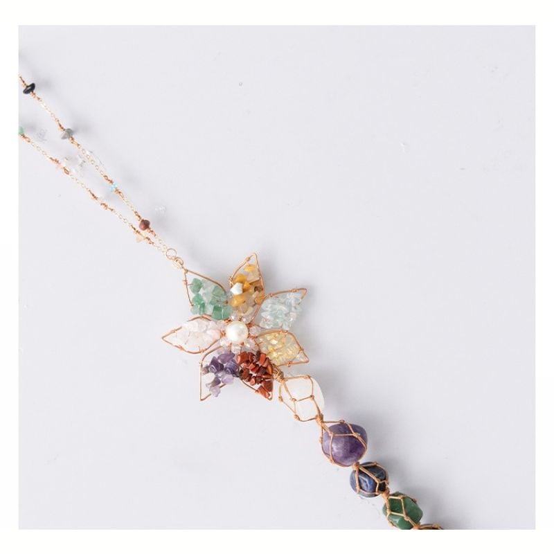 可憐なフラワーモチーフのトップに、さまざまな天然石を縦に連ねたサンキャッチャー。