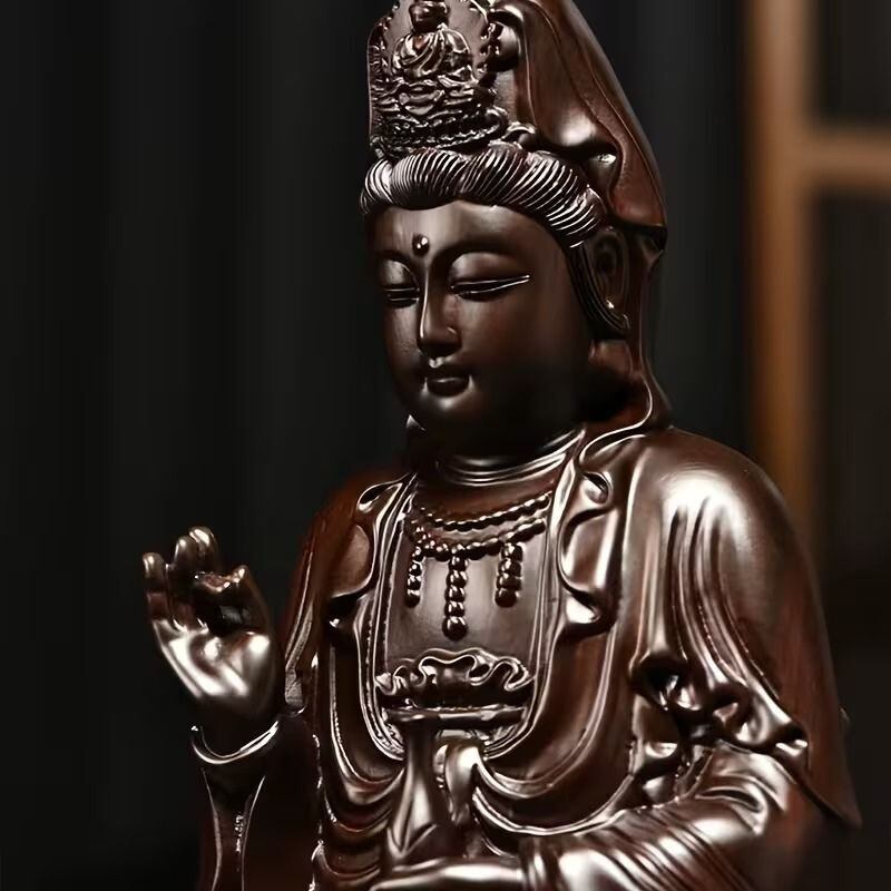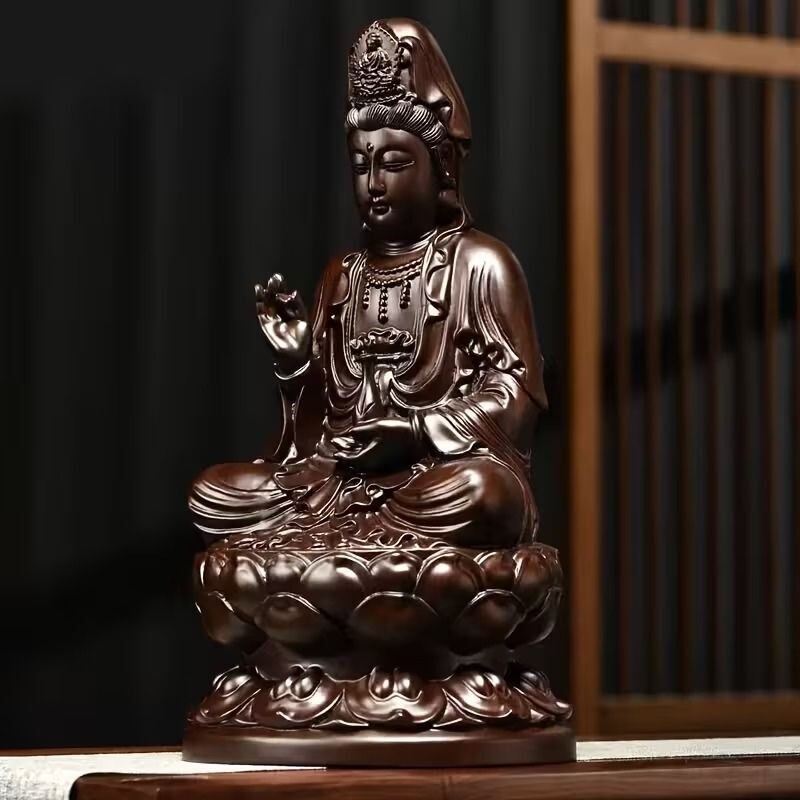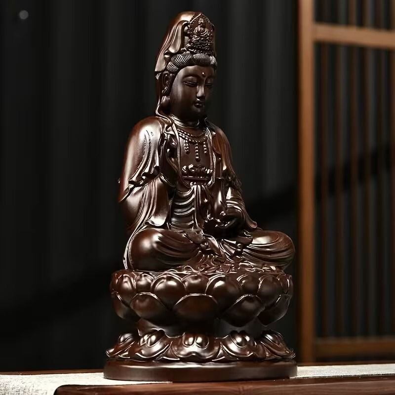 静かに佇む観音菩薩の姿を表現した、落ち着きあるブラウン調のインテリア置物です。