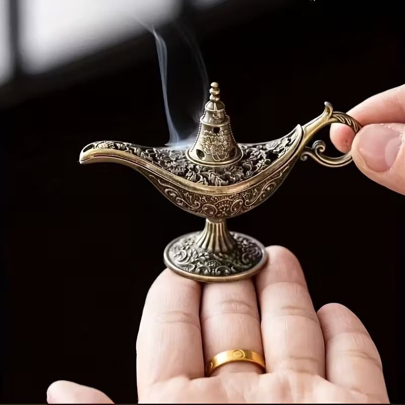 異国情緒あふれるアラジンランプ型のバックフロー香炉です。繊細な装飾が施されたアンティーク調デザインは、置くだけで幻想的な雰囲気を演出します。煙がゆっくりと流れ落ちる逆流タイプのお香に対応し、まるで物語のワンシーンのような美しい煙の動きをお楽しみいただけます。