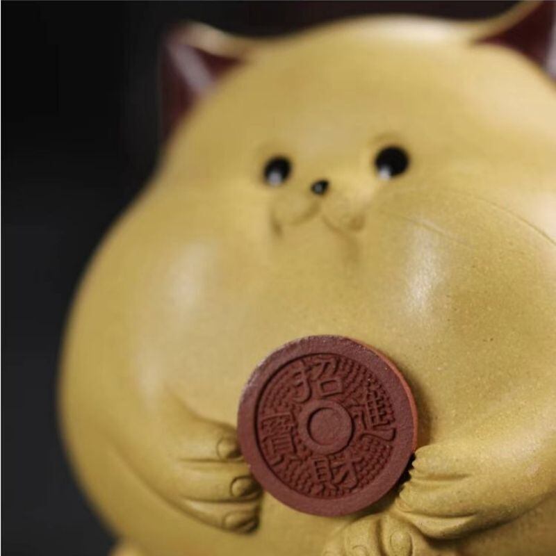 ころんと丸いフォルムに、そっと古銭を抱えた愛らしい招き猫のオブジェです。