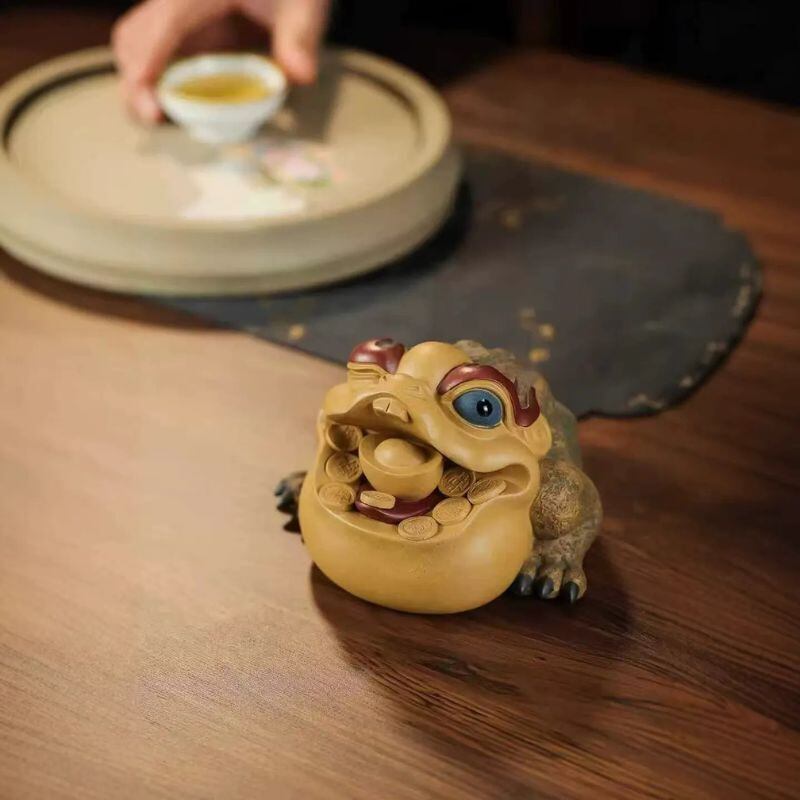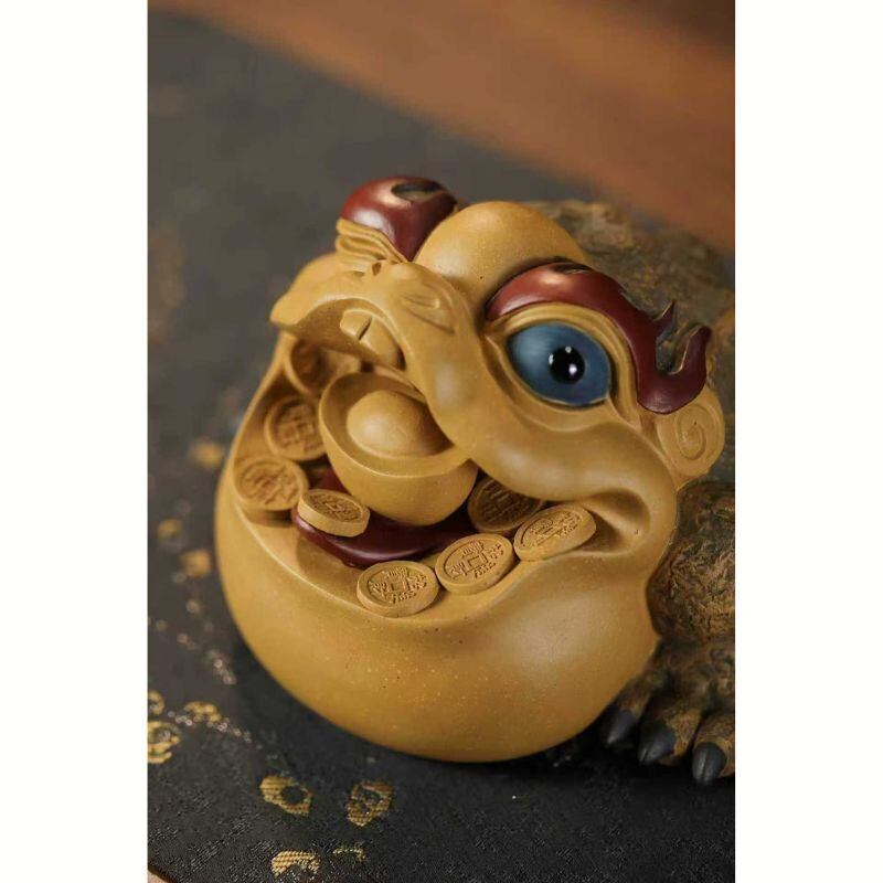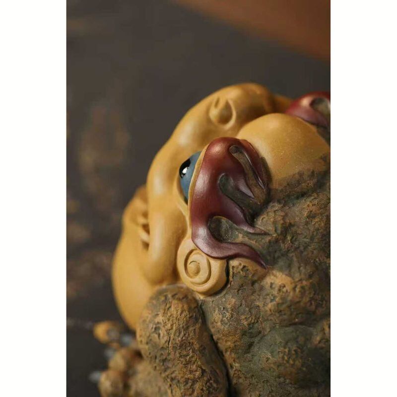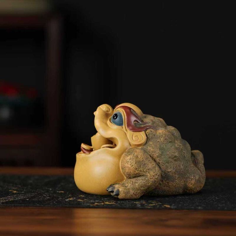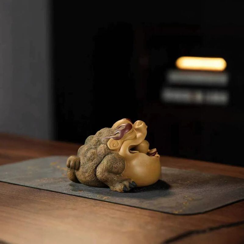 暮らしの中では、茶盤や茶卓の上に飾ってお茶の時間をより印象深く演出したり、玄関やリビングの棚、書斎やデスクの上に置いて象徴的なアクセントとして楽しんだりするのもおすすめです。観葉植物、木製トレー、天然石、小ぶりな茶器などと組み合わせれば、より奥行きのある開運インテリアとして空間を整えやすくなります。風水の意味合いを大切にしながら、茶席を彩る茶玩としても、個性ある卓上オブジェとしても楽しみたい方に手に取っていただきやすい一品です。