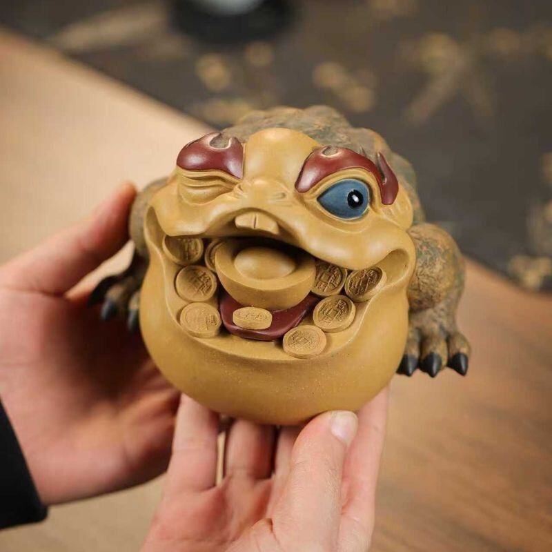こちらは、宜興紫砂らしい落ち着いた風合いを感じさせる、三本足の蛙をモチーフにした茶玩・茶卓置物です。丸みを帯びた力強いフォルムに、片目を閉じたような印象的な表情、大きく開いた口元に配された元宝や古銭が組み合わさり、遊び心と重厚感を兼ね備えた仕上がりになっています。背中の凹凸感や脚先の細かな造形まで丁寧に表現されており、眺めるたびに味わいを感じやすいのも魅力です。茶席や茶卓に置いた際にも空間になじみやすく、和モダンや中華風、アジアンテイストのインテリアにも自然に溶け込みやすそうです。