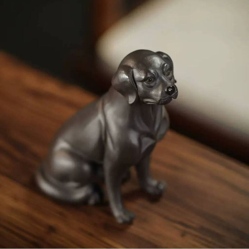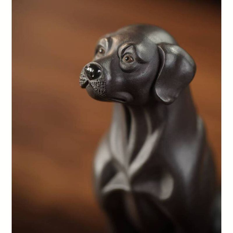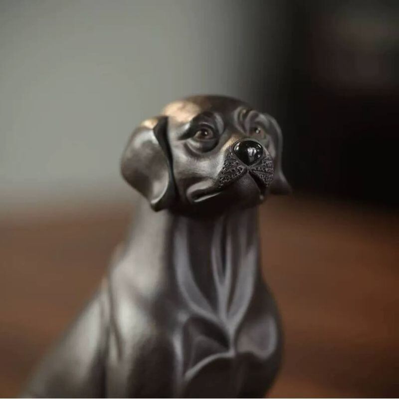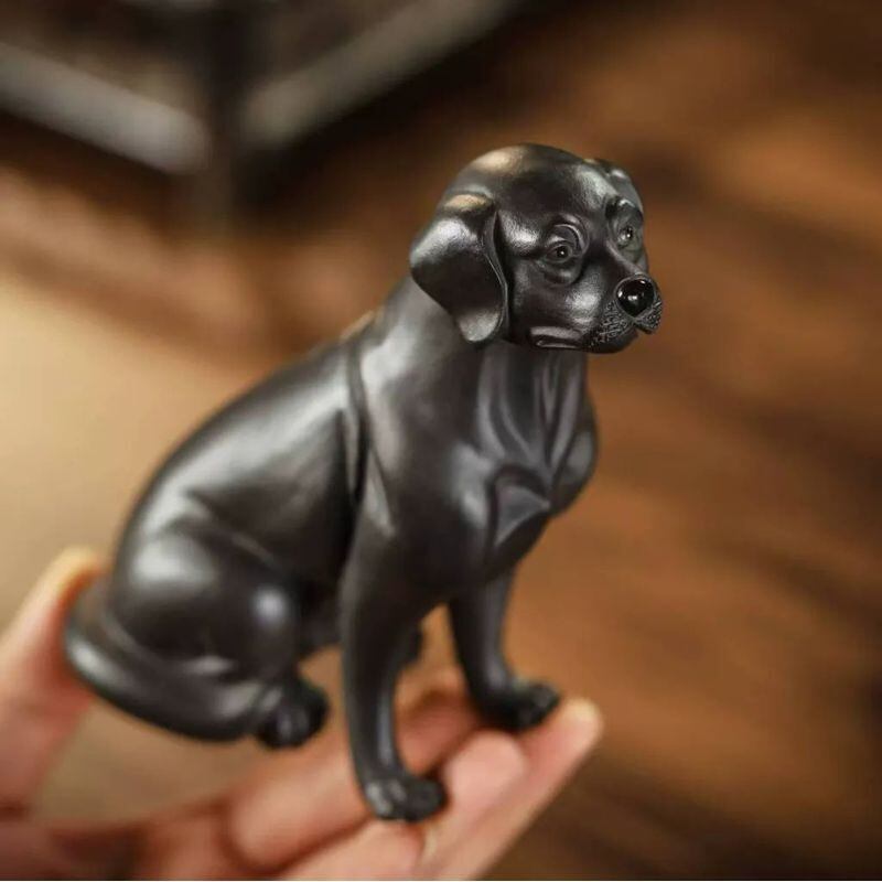 こちらは、焼き物のような落ち着いた質感が魅力の、黒犬モチーフの茶玩・卓上置物です。すっと座る姿勢と少し見上げるような表情が印象的で、愛らしさの中にも凛とした品のよさを感じさせてくれます。身体のラインはなめらかに整えられており、過度な装飾を抑えたシンプルな造形だからこそ、素材感や佇まいの美しさが引き立ちます。