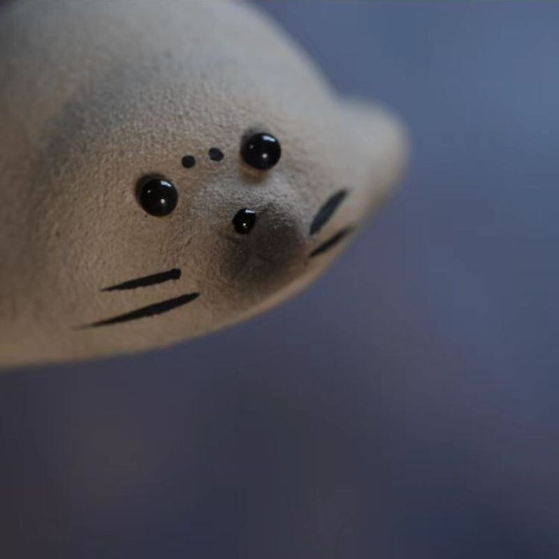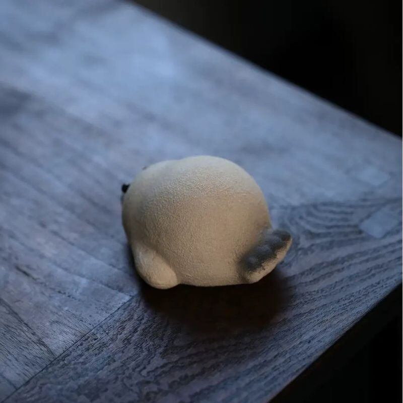こちらは、ころんとした丸いフォルムが愛らしい、あざらしモチーフの卓上置物です。つぶらな瞳と小さな鼻、ひげのような繊細な表現が可愛らしく、見つめるたびに気持ちがゆるむような、やさしい存在感を楽しめます。焼き物のような落ち着いた質感も魅力で、甘くなりすぎず、和モダン、ナチュラル、シンプルなお部屋にも自然になじみやすそうです。茶席や茶卓に添える茶玩としてはもちろん、棚の上やデスクの片隅にそっと置くだけでも、空間のアクセントとして心地よい雰囲気を添えてくれそうです。