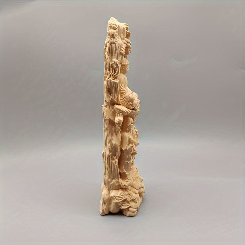 この「黄楊木彫刻の三位一体の仏像」は、仏教の極楽浄土を象徴する大切な存在で、西方三聖(阿弥陀如来、観音菩薩、勢至菩薩)の姿が丁寧に彫り込まれています。