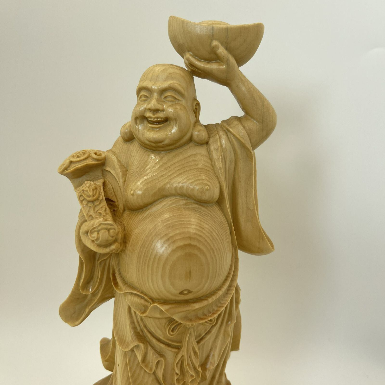 また、このヒノキの木彫りの布袋様は、熟練の職人によって一つ一つ手作業で彫られており、その精緻な彫刻と温かみのある表情が、見る人の心を和ませます。インテリアとしても非常に魅力的で、どんな空間にも自然に溶け込み、豊かな雰囲気を作り出します。