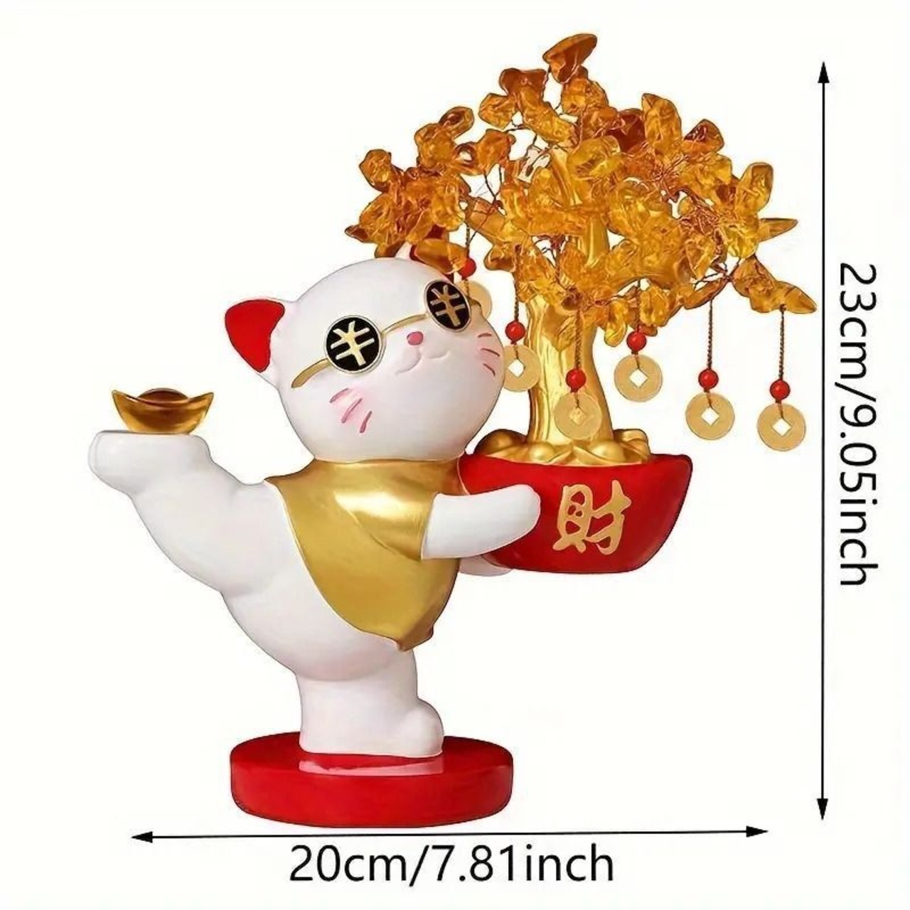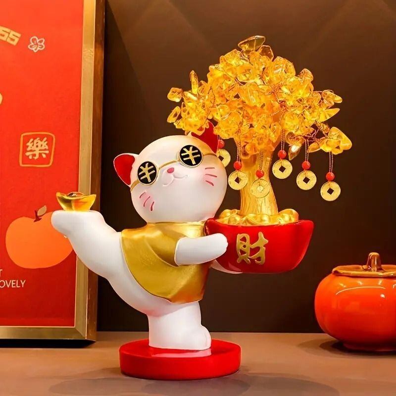 この置物は、縁起の良い「金のなる木」と幸運を象徴する猫、さらに「財」の漢字が描かれた赤色の鉢が組み合わさった、運気アップを願う方にぴったりのアイテムです。金のなる木は、財運を引き寄せ、豊かさをもたらす象徴として古くから風水において重要視されており、特に金運やビジネスの繁栄を願う方に広く信仰されているようです。