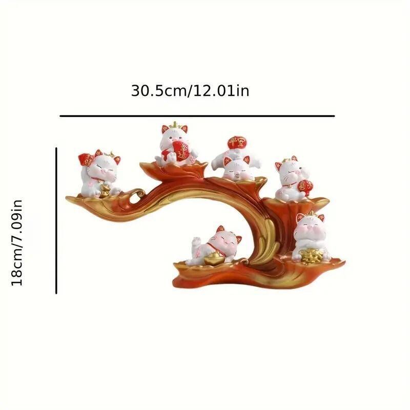 この可愛らしい招き猫は、6匹の猫たちが木の上で楽しそうに過ごしているデザインが特徴です。招き猫は古くから商売繁盛や家庭の幸せを呼び込む縁起物として信仰されていますが、この木の上に集まった猫たちは、さらに活気と繁栄を象徴しています。