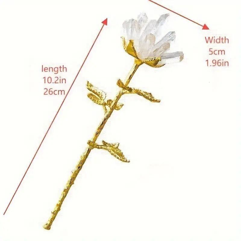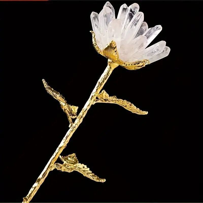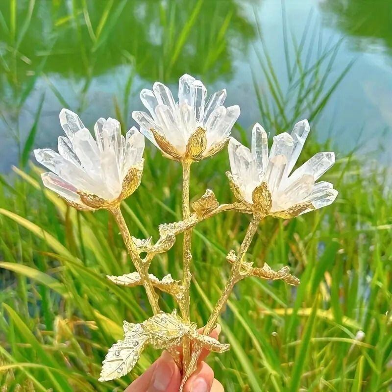 ホワイトクォーツは、日常の中で乱れたエネルギーを浄化し、持つ人に調和と安定をもたらすと言われています。仕事や人間関係で疲れた時、この華やかな造花が癒しのサポートをしてくれるかもしれません。また、ゴールドの茎は繁栄と成功を象徴し、風水では金運を呼び込む色として大切にされているようです。お部屋に飾ることで、より豊かな日々が訪れるように願いが込められたオブジェです。