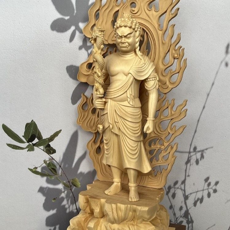 この不動明王像は、細部まで丁寧に彫刻された木製のオブジェで、手作りならではの温かみと力強さが特徴です。不動明王は「動かない心」を象徴し、日常生活での心の安定や、困難に打ち勝つ力を与える存在とされています。風水でも、この像を家に飾ることで、悪いエネルギーを浄化し、家族やビジネスを守護すると言われています。