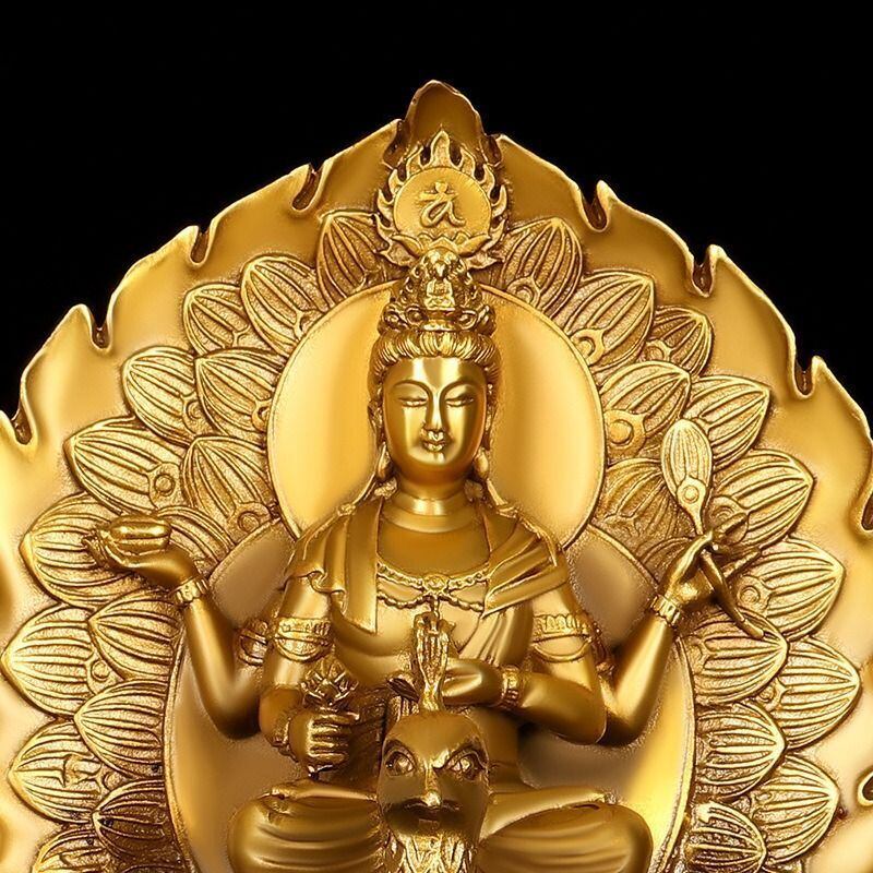 孔雀明王は、仏教において病魔や災厄から人々を守り、癒しをもたらす神として崇められてきました。その名の通り、孔雀の姿を持ち、鮮やかな羽を広げる姿が特徴的です。孔雀は古くから毒蛇を食べると信じられており、そのため「毒をも浄化する存在」として強い守護の象徴とされています。このオブジェは、そんな孔雀明王を美しい黄金で仕上げ、神聖で力強いオーラを放つ一品です。