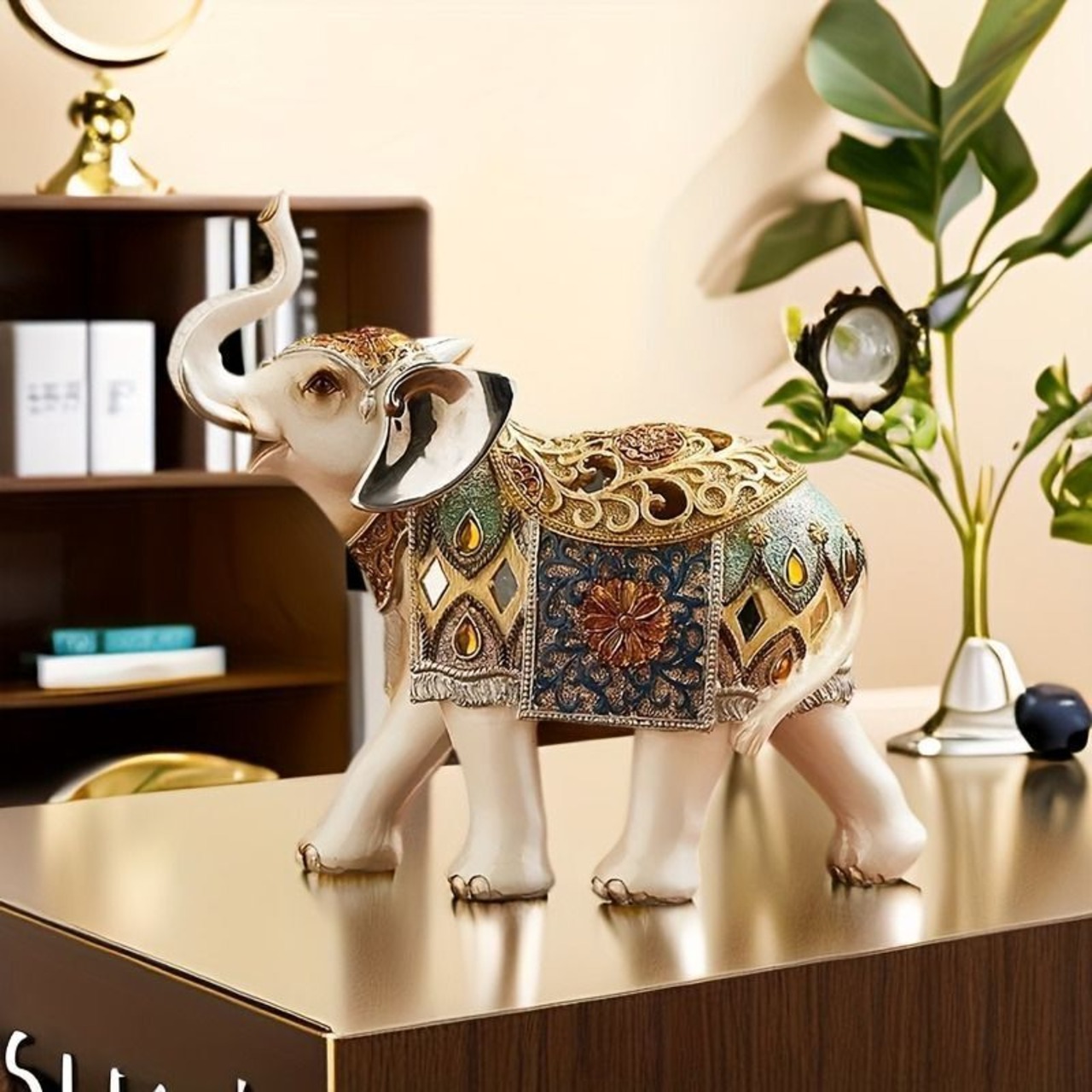 この豪華な装飾が施された象の置物は、力強さと安定の象徴として、古くから多くの文化で崇められてきたみたいです。特に象は、富や繁栄を招くとされ、ビジネスや家庭に安定した成功をもたらすと信じられています。また、象の穏やかで強靭な姿は、困難を乗り越える力を象徴し、目標達成や新たな道を切り開く力を授けるとも言い伝えられています。