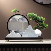この盆栽の隣に配置された流砂アートは、時間の流れと自然の美しさを静かに表現しています。流砂がゆっくりと形を変えていく姿は、ストレスを和らげ、心を落ち着かせる効果が期待できるとされています。風水では、流れる砂や水が「流れ」を象徴し、気の停滞を防ぎ、ポジティブなエネルギーを呼び込むと言われています。