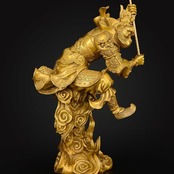 金色に輝く孫悟空の置物は、力と知恵の象徴として知られるオブジェです。孫悟空とハヌマーンは、アジアの神話と宗教において特別な存在として広く崇拝されてきました。孫悟空は中国の伝統物語「西遊記」の英雄であり、知恵と冒険心を持つ存在とされています。一方、ハヌマーンはヒンドゥー教の神として力強さと献身を象徴し、試練に立ち向かう勇気をもたらす神として親しまれています。この二人の力強いエネルギーが一体化したデザインは、成功への道を切り開く後押しとして飾られることが多いです。
