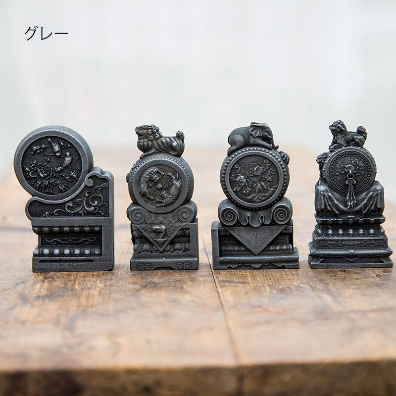 古代中国において建築物の入り口に設置された「抱鼓石門墩(ほうこいしもんとん)」は、魔除けや繁栄の象徴とされ、家を守護する役割を担ってきました。この伝統的な石門墩のデザインに、風水や神話の世界で強い影響力を持つ三体の動物――麒麟、象、そして獅子――が組み合わされています。それぞれが豊かさ、知恵、勇気の象徴とされ、飾ることで調和と安定を導くと信じられています。