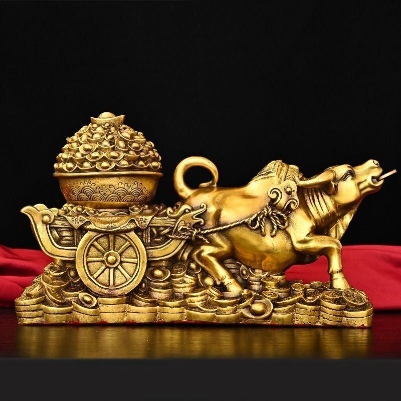 古代から財運や繁栄を象徴する存在として愛されてきたアイテムです。牛車は豊かさや成功を運んでくるシンボルとして信じられ、特にこの黄金色の置物は、その輝きからも富や幸運を引き寄せると考えられています。この牛車が財宝を運ぶ姿は、金運の向上や仕事運の発展を願う方々にぴったりのモチーフです。