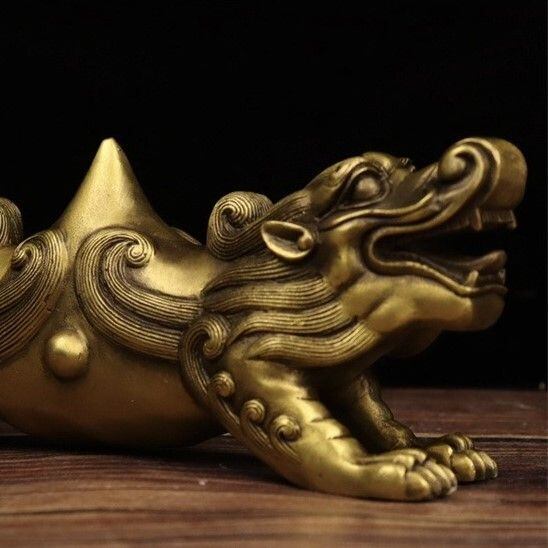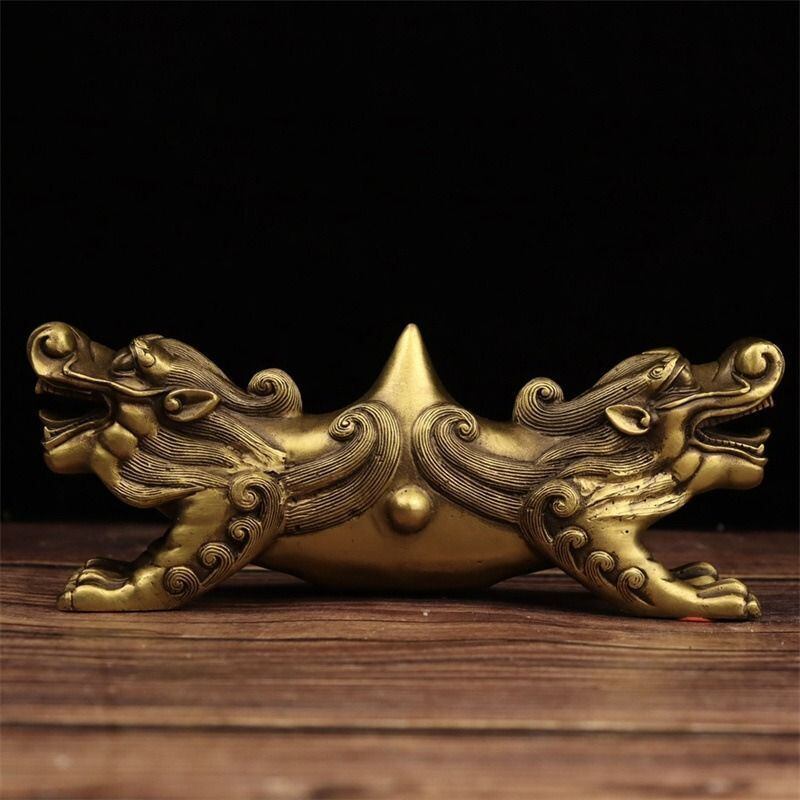 風水では、獅子は「門を守る守護獣」として、家やオフィスの入り口に飾ることで、悪いエネルギーや不運から家を守り、良い運気を引き寄せるとされています。双頭のデザインは、二つの異なる力が調和し合うことを示しており、家庭内やビジネスにおいても調和と繁栄をもたらすと言われています。このアンティークゴールドの色合いは、金運や富を象徴し、上品でありながらも力強さを感じさせる存在感を放っています。